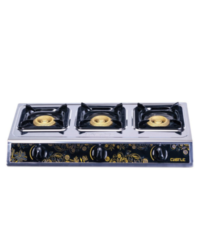 بوتاجاز مسطح كاسيل يعمل بالغاز مع 3 شعلات قوية وتصميم أنيق باللون الفضي ليوفر لك أداءً عمليًا ومظهرًا عصريًا في مطبخك.